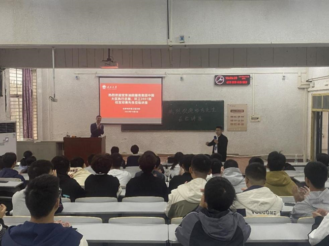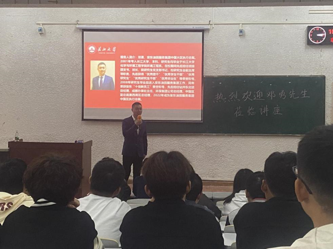 (通讯员 王梦睿 蔡 略)10月3日15:00,安东油田服务集团中国大区执行总裁、化工2001级校友邓勇莅临学校,在西校区5教203应邀为一大新生作报告。报告由学院党委副书记杨会军老师主持,100余名新生参加了此次报告。