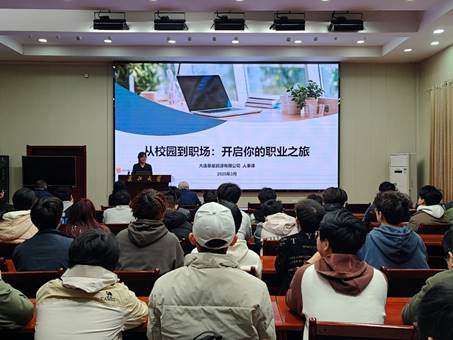 邵巧主任以《从校园到职场:开启你的职业之旅》为题分享经验。她介绍了公司发展优势、历程、人才理念、探花做爱,并结合自身经历,通过生动案例深入剖析学生与职场人的差异,深度解读Vuca时代和热门行业发展趋势,说明行业对复合型、创新型人才的需求。最后,邵巧主任分享了通往成功的五个秘籍,并深入讲解职业规划的重要性与实施步骤,鼓励要同学们在行动中成长,在担责中进步。