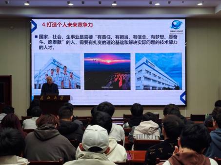 许国庆副总经理带来以《绿色能源创新的现代与未来——技术、产业与青年使命》为题的报告。他聚焦绿色能源行业前沿,深入解读先进技术、战略定位、创新成果及零碳场景打造,让同学们对绿色能源领域有了更深入的认识。在谈到能源革命与青年机遇时,许经理指出,能源革命催生新赛道,为青年创造了广阔的发展空间。泰星的“青创实验室”人才赋能体系,正是助力青年成长的有力平台,他鼓励同学们打牢基础,树立终身学习理念,在时代浪潮中勇立潮头。