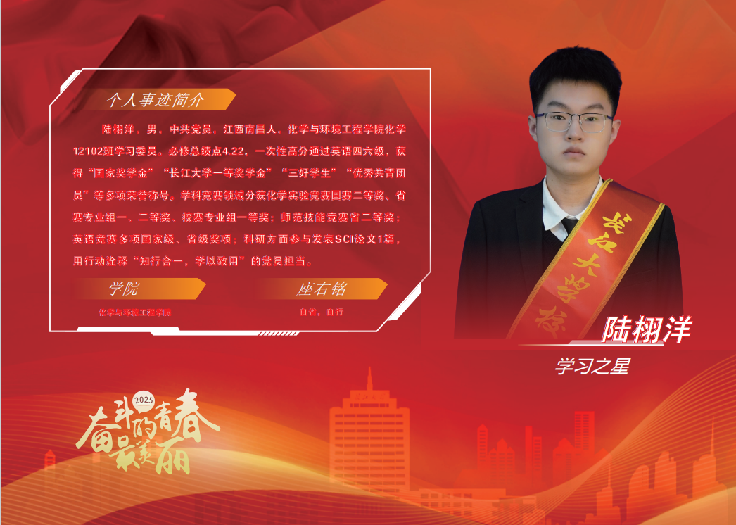 四年的大学生活中,陆栩洋同学始终以奋发向上的决心,努力学习专业知识、积极培养科研能力、主动投身社会实践。知行合一,不断自我反省,砥砺前行,走出了一条属于他自己的奋进之路。