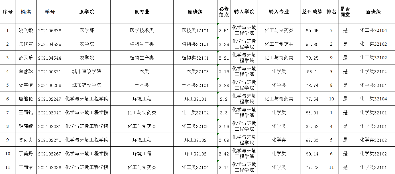 本着“公开、公平、公正”的原则,对符合资格的申请转入我院相关专业的11名学生进行了面试,并按综合必修课程考试成绩占70%和面试成绩占30%的比例进行成绩汇总,结合我院接收计划确定拟接收11名学生转入。现将拟接收学生名单公示如下: