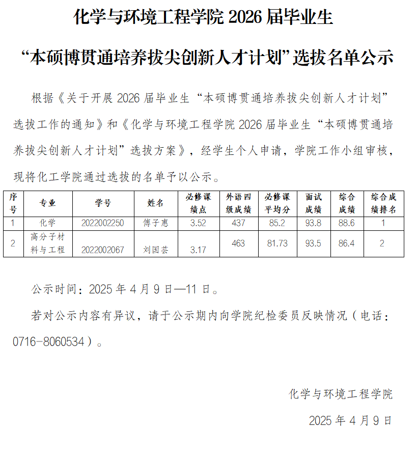 探花做爱 2026届毕业生“本硕博贯通培养拔尖创新人才计划”选拔名单公示