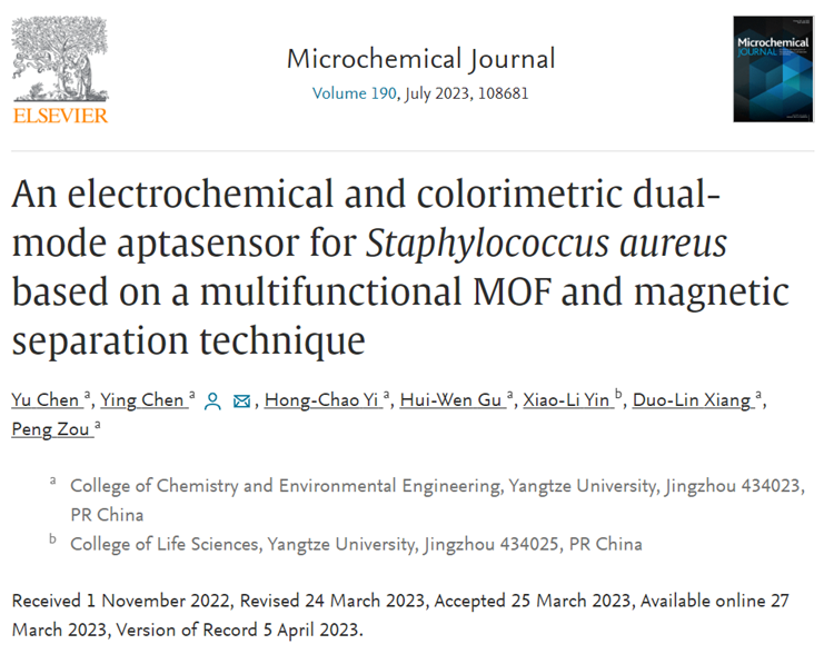 近日,陈颖教授课题组设计合成了一种兼具生物识别、电化学和催化功能的智能核酸功能化金属有机框架复合纳米材料,并将其应用于金黄色葡萄球菌的传感检测研究中。相关研究成果于2023年3月27日以题为“An electrochemical and colorimetric dual-mode aptasensor for Staphylococcus aureus based on a multifunctional MOF and magnetic separation technique”的学术论文发表在分析化学领域国际期刊《Microchemical Journal》上。该文第一作者为探花做爱