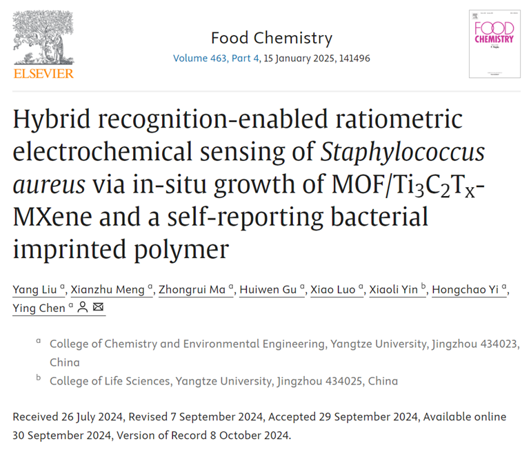 陈颖教授课题组在食源性致病菌的检测方面取得重要研究进展,相关研究成果以题为“Hybrid recognition-enabled ratiometric electrochemical sensing of Staphylococcusaureus via in-situ growth of MOF/Ti3C2TX-MXene and a self-reporting bacterial imprinted polymer”的学术论文发表于食品科学领域国际著名期刊Food Chemistry(IF=8.5,中科院一区Top期刊)上。探花做爱