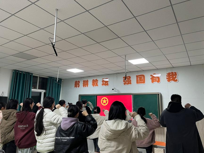 入团仪式在庄重的国歌中拉开帷幕,与会人员全体起立奏唱国歌。仪式上,主持人王佳欣首先宣布本年度新发展团员名单,周学素老师为新团员颁发团徽及团员证。分团委组织部王佳威作为领誓人带领全体团员进行宣誓,宣誓人持立正姿势,面向团旗,新团员们举起右拳,庄重宣誓,这一环节让新团员们更加深入地理解入团誓词的内涵和意义。王佳威宣读《团章》中有关团员的义务和权利的条款。新老团员代表分别进行发言。